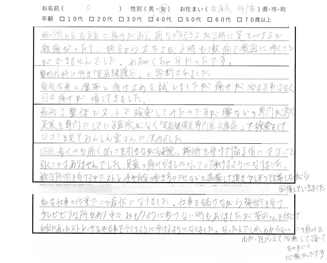数ヶ月前から右足裏に痛みがあり、朝など起き上がる時に足をつけると激痛だったり、椅子から立ち上がる時も激痛で普通に歩くことができませんでした。めちゃくちゃ辛かったです。