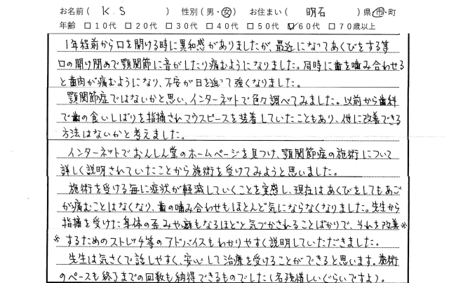 インターネットでおんしん堂のホームページを見つけ、顎関節症の施術について詳しく説明されていたことから施術を受けてみようと思いました。
