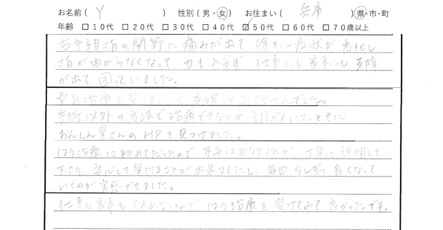 右手親指の関節に痛みが出て、徐々に症状が悪化し指が曲がらなくなって、力も入らず仕事にも家事にも支障が出て困っていました。