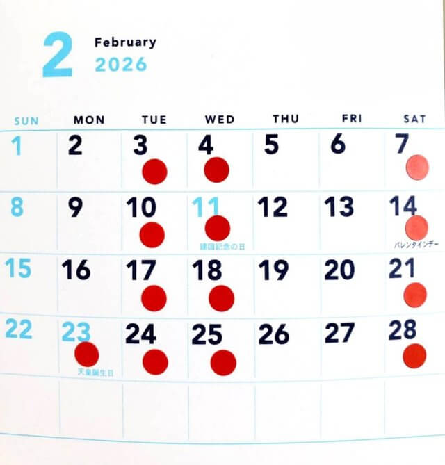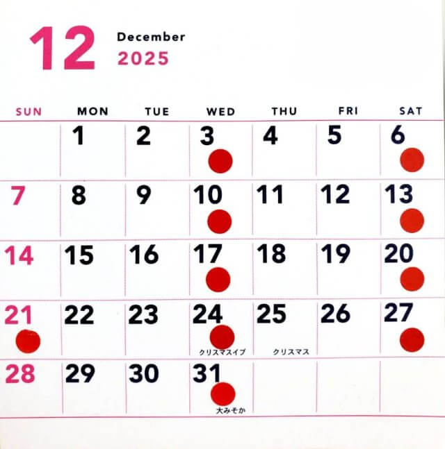 カレンダーの赤丸(毎週水曜日・土曜日・祝日)がお休みになっています。