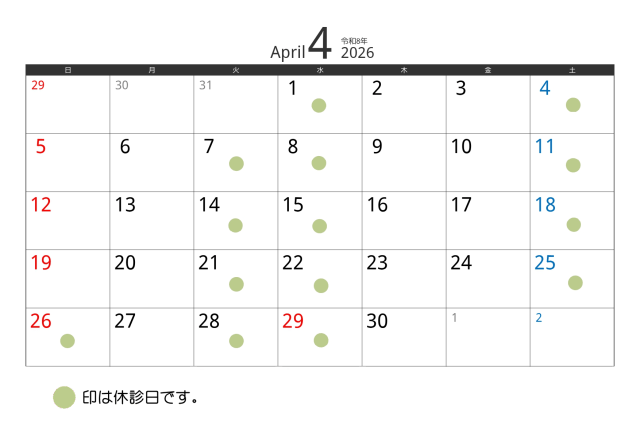 カレンダーの緑丸(毎週火・水・土、祝日)がお休みです。