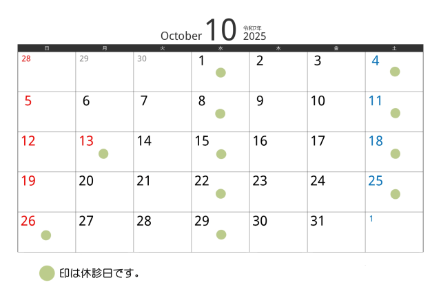カレンダーの緑丸(毎週水曜日・土曜日・祝日)がお休みになっています。